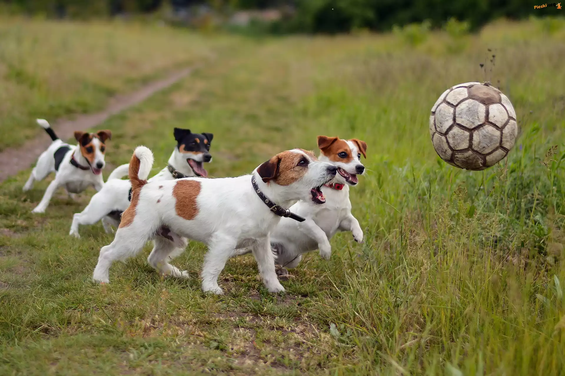 Łąka, Zabawa, Psy, Piłką, Jack Russell Terrier