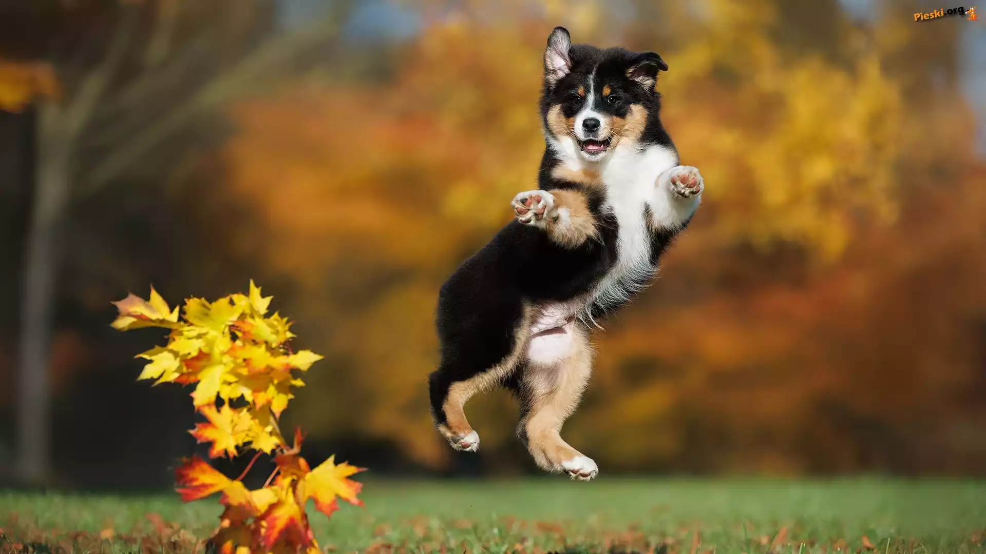 Liście =, Szczeniak, Owczarek australijski, Pies, Pożółkłe, Skok, Pieski