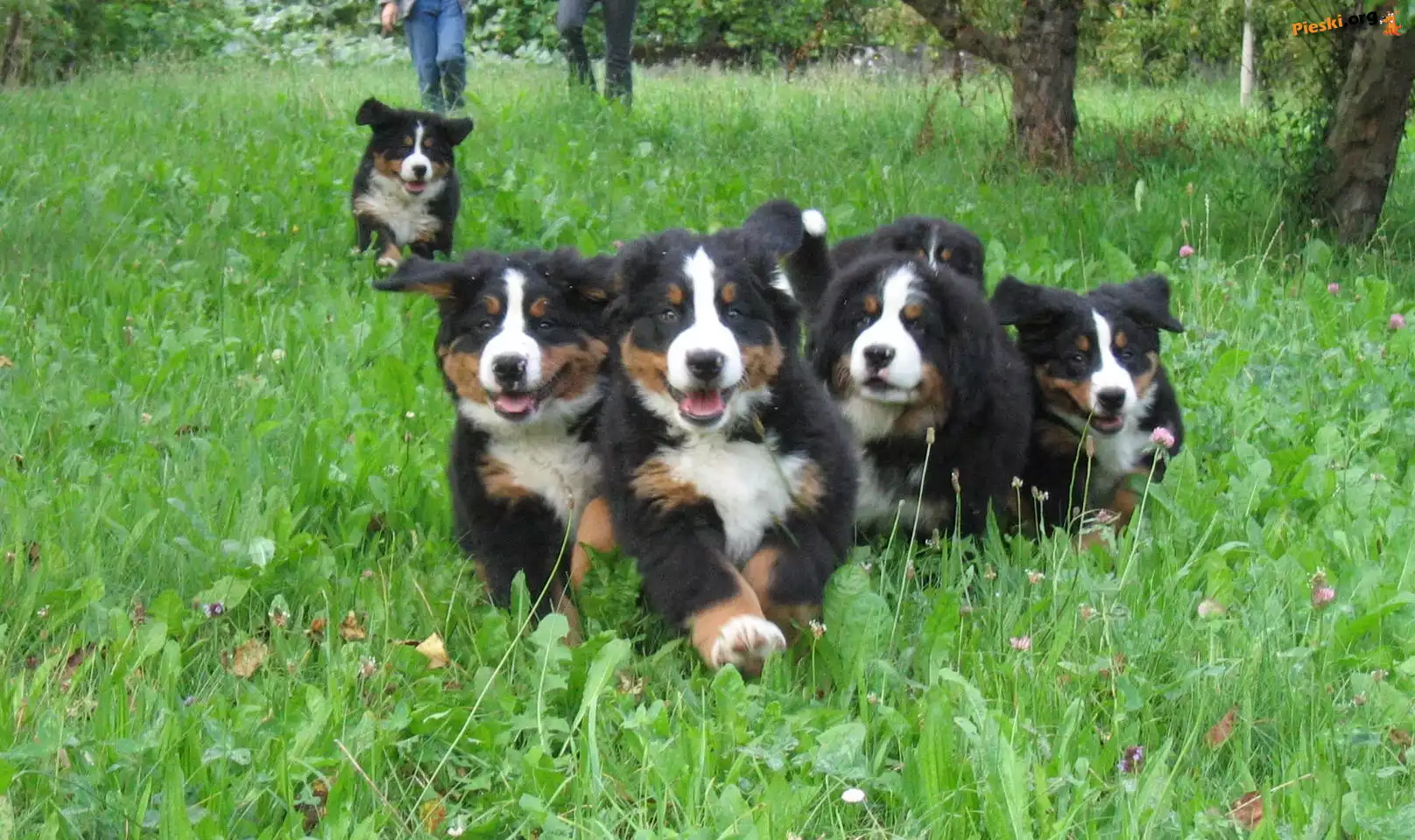 Berneńskie psy pasterskie, zielona, trawa, Pieski