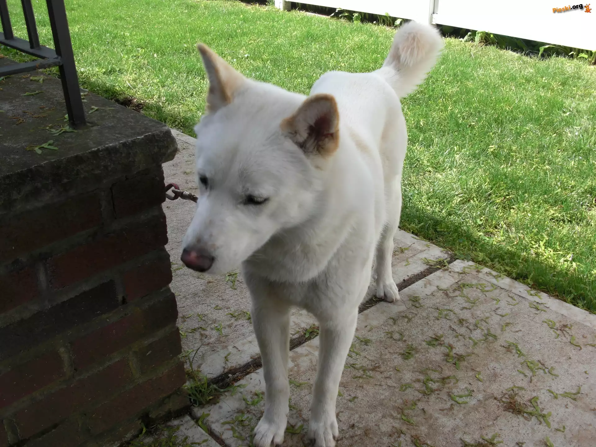 biały, Jindo głowa, Jindo Kamyczki, Jindo, Piesek kły, pysk, język, Jindo