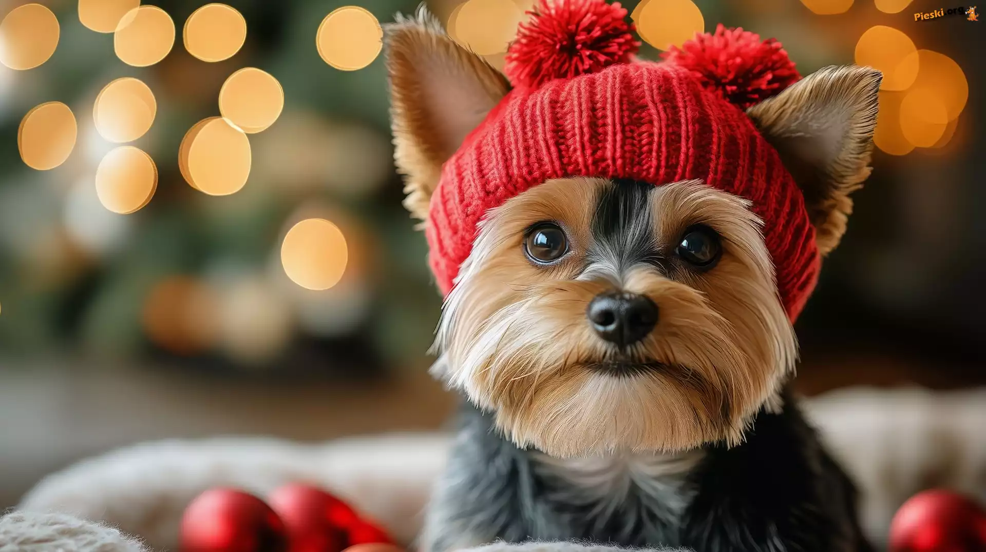 Czerwona, AI, Pies, Czapka, Yorkshire terrier, Pieski