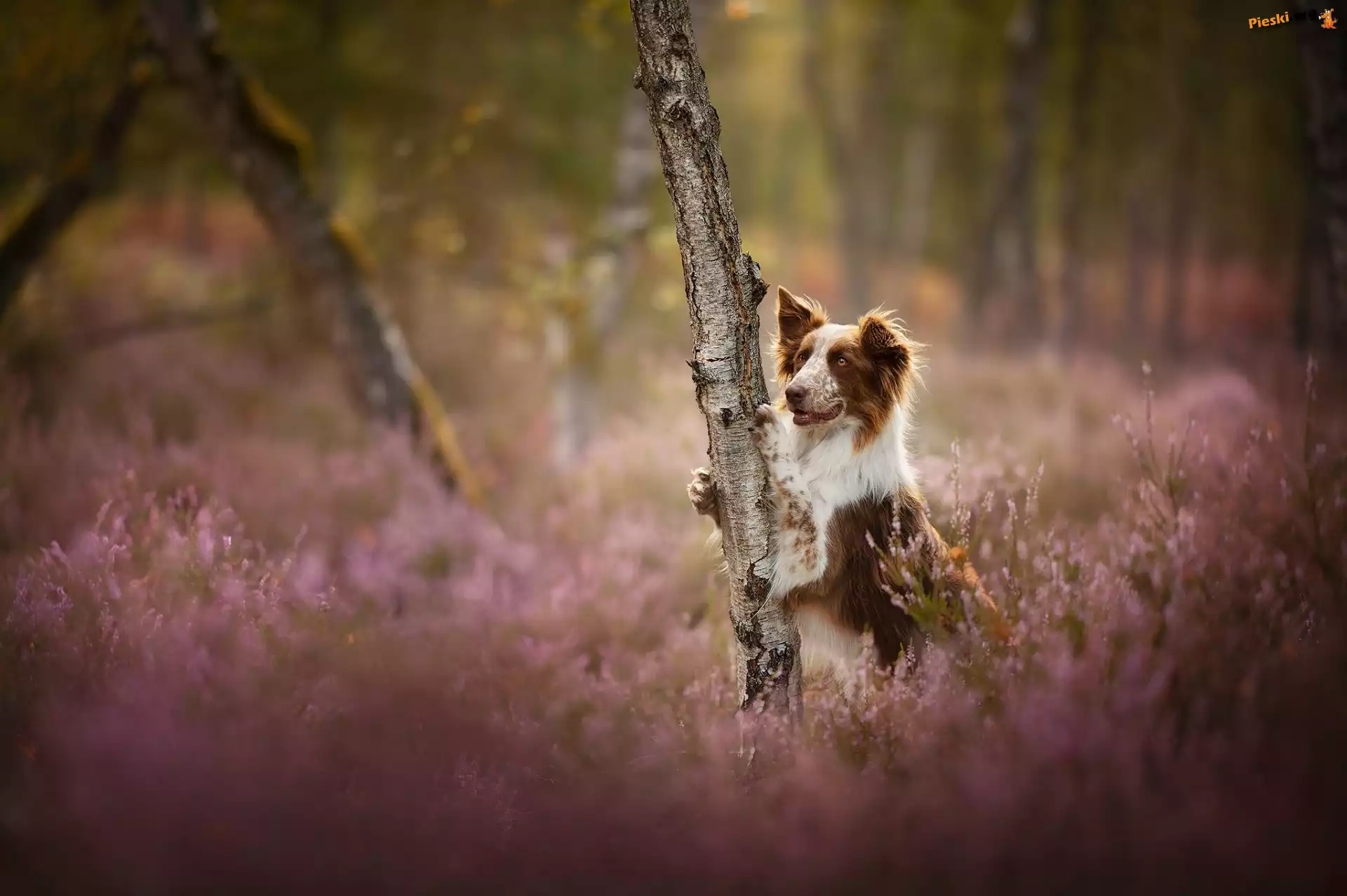 Drzewo, Pies, Border collie, Wrzosy