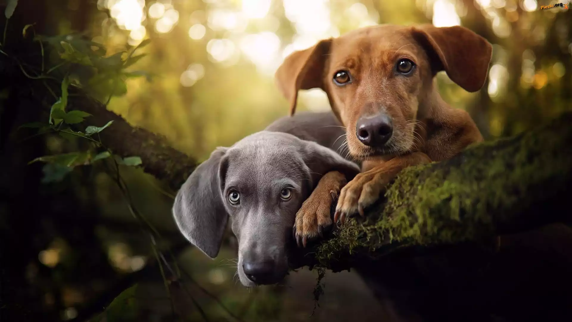 Drzewo, Dwa, Konar, Wyżeł weimarski, Psy, Nierasowy, Las, Pieski