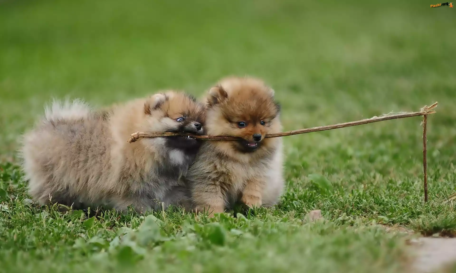 Łąka, Dwa, Patyk, Szpice miniaturowe, Szczeniaki, Pomeraniany, Zabawa