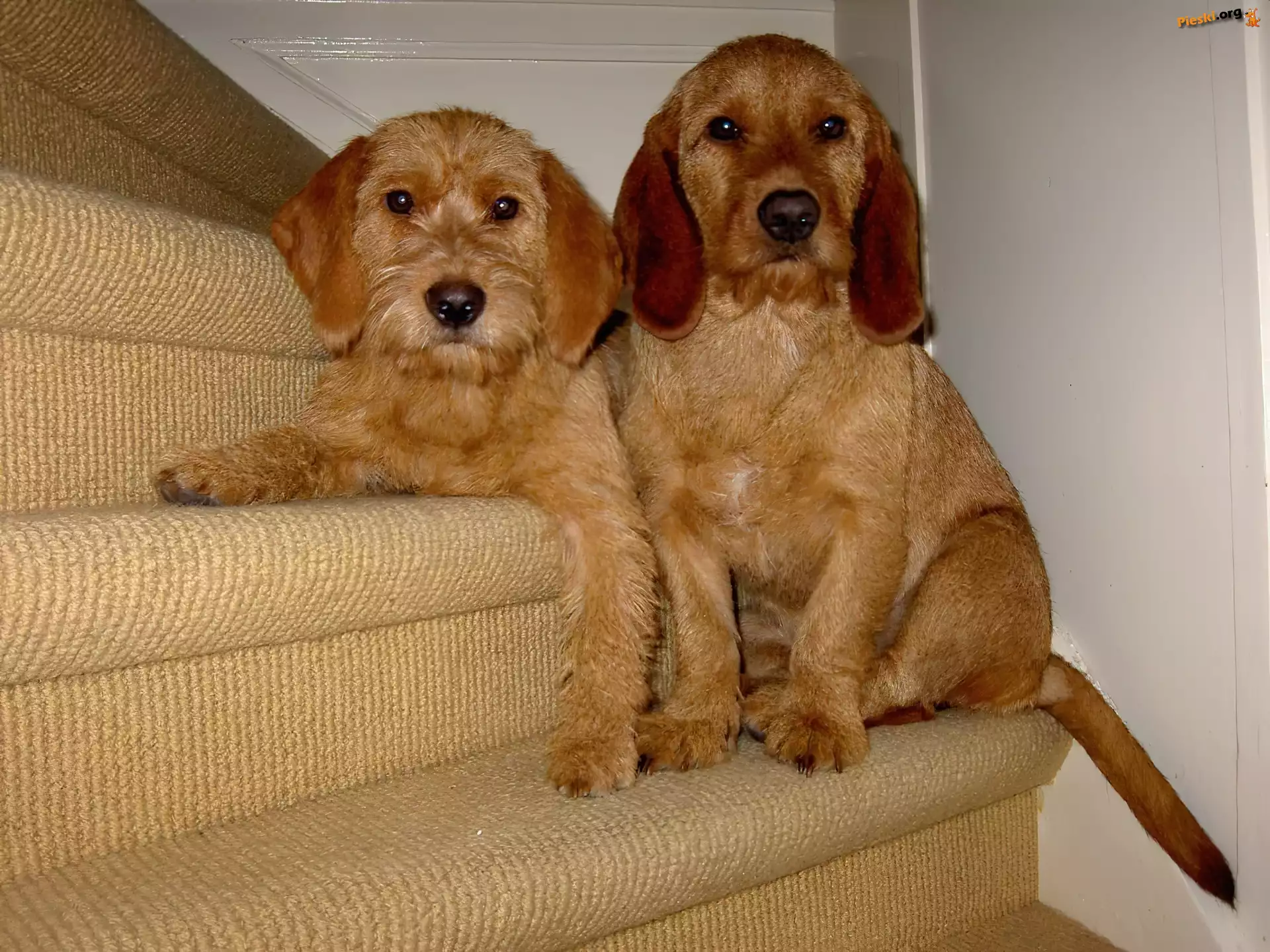 Basset Fauve de Bretagne, dwa, słodkie, schody Basset Fauve de Bretagne skulony, Basset Fauve de Bretagne