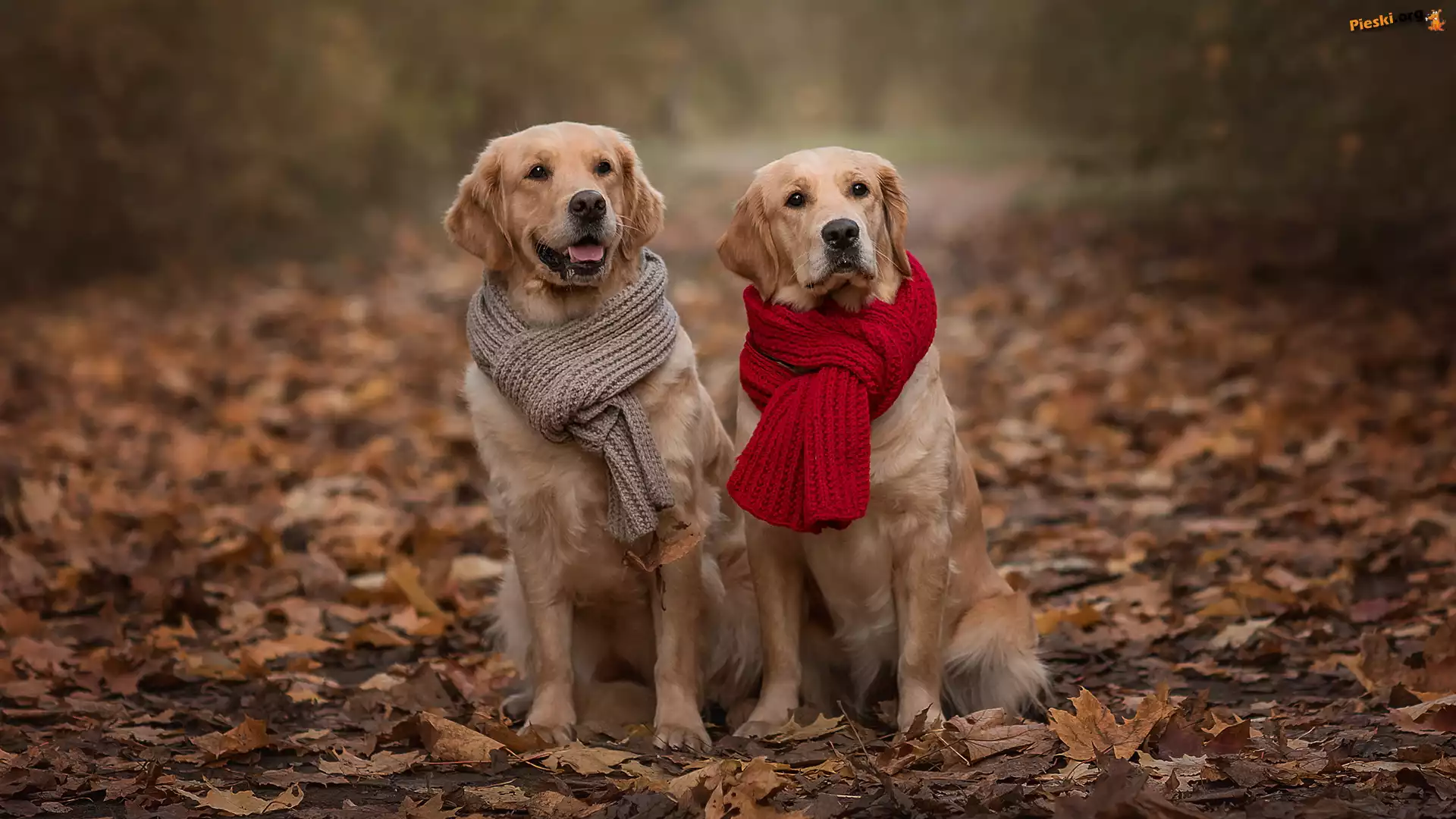 Golden retriever, Dwa, Psy, Szaliki, Pieski