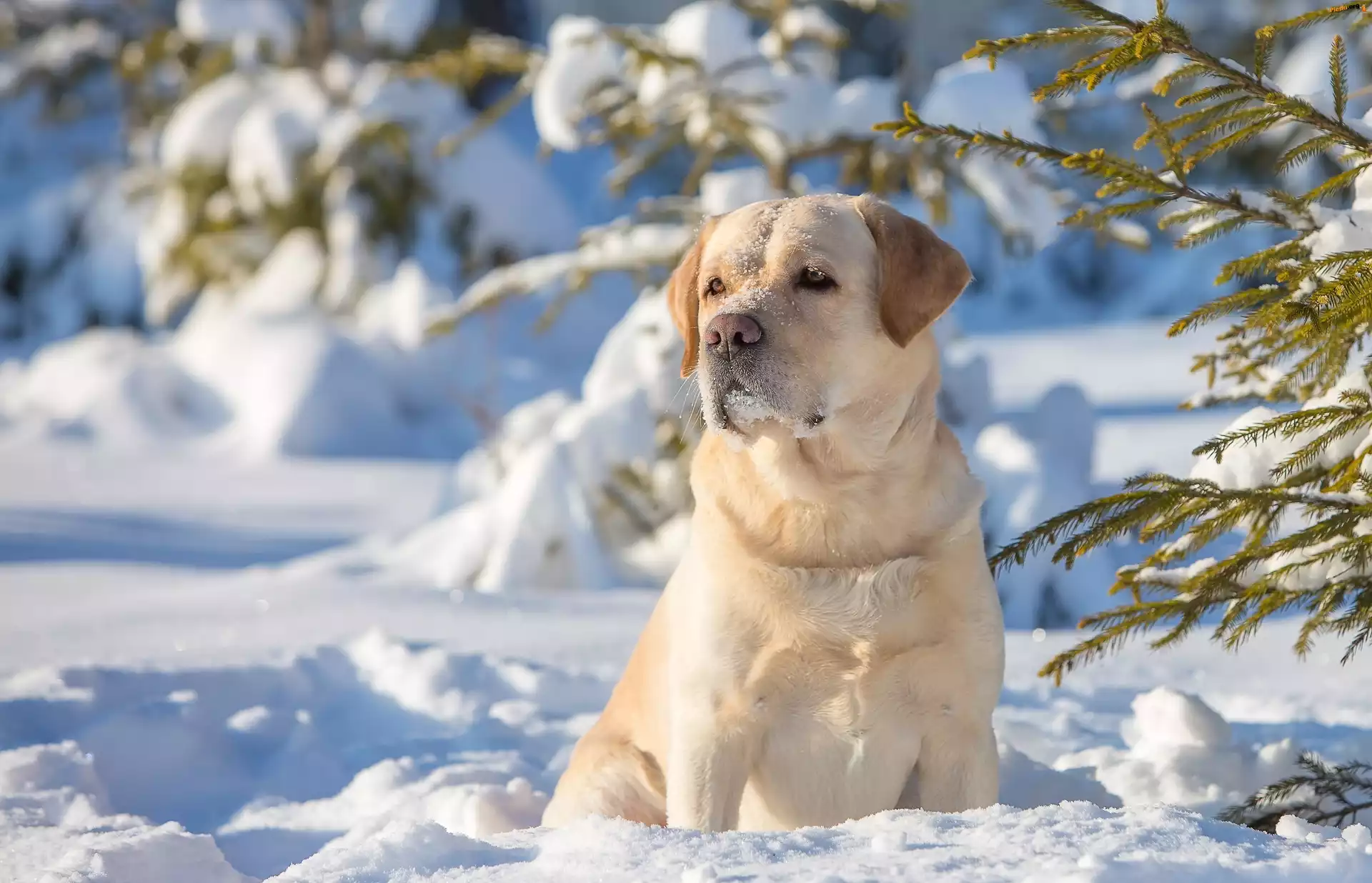 Las, Golden Retriever, Drzewa, Zima, Pieski