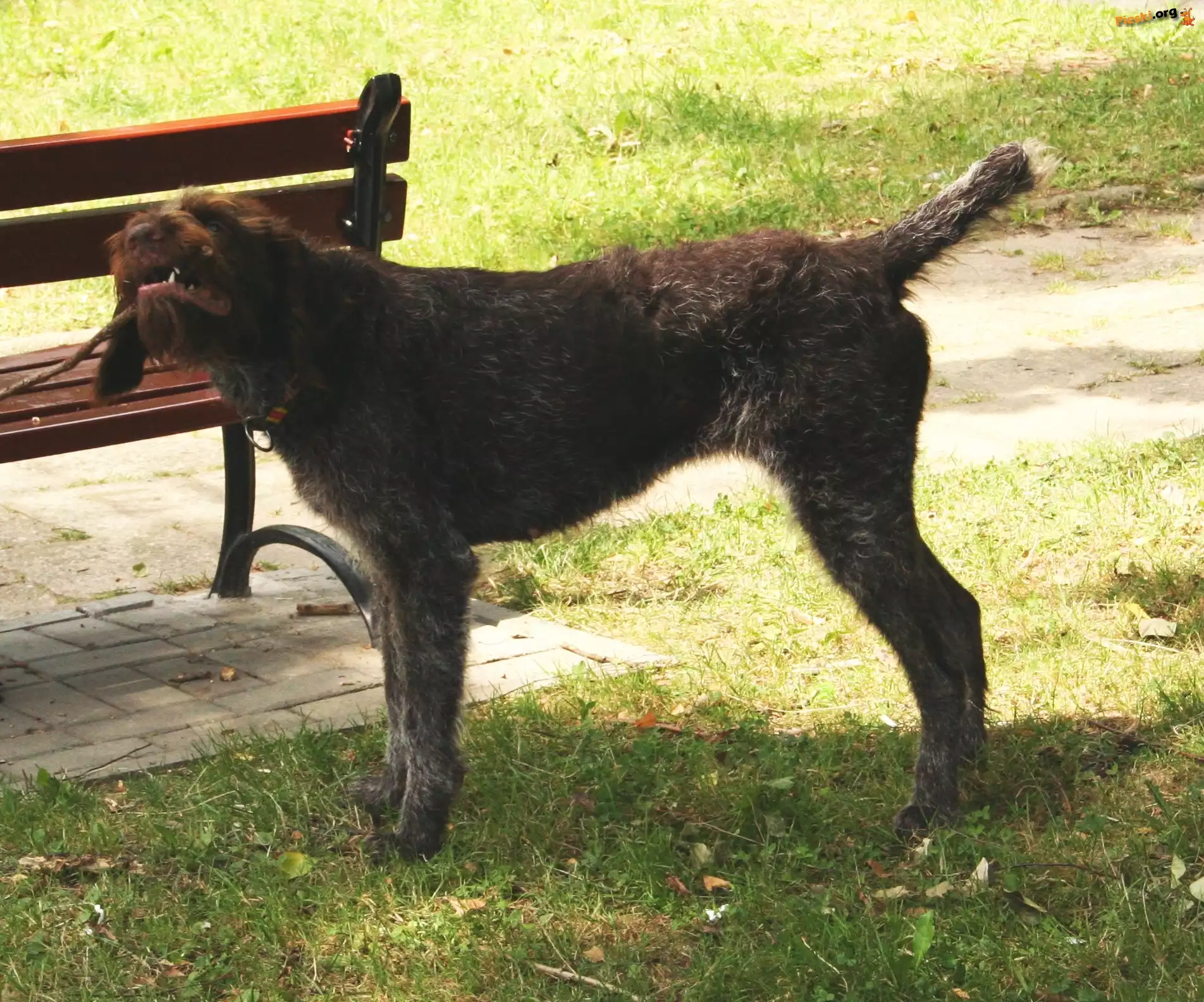 ławka, Wyżeł niemiecki szorstkowłosy, trawa, kij, Pieski