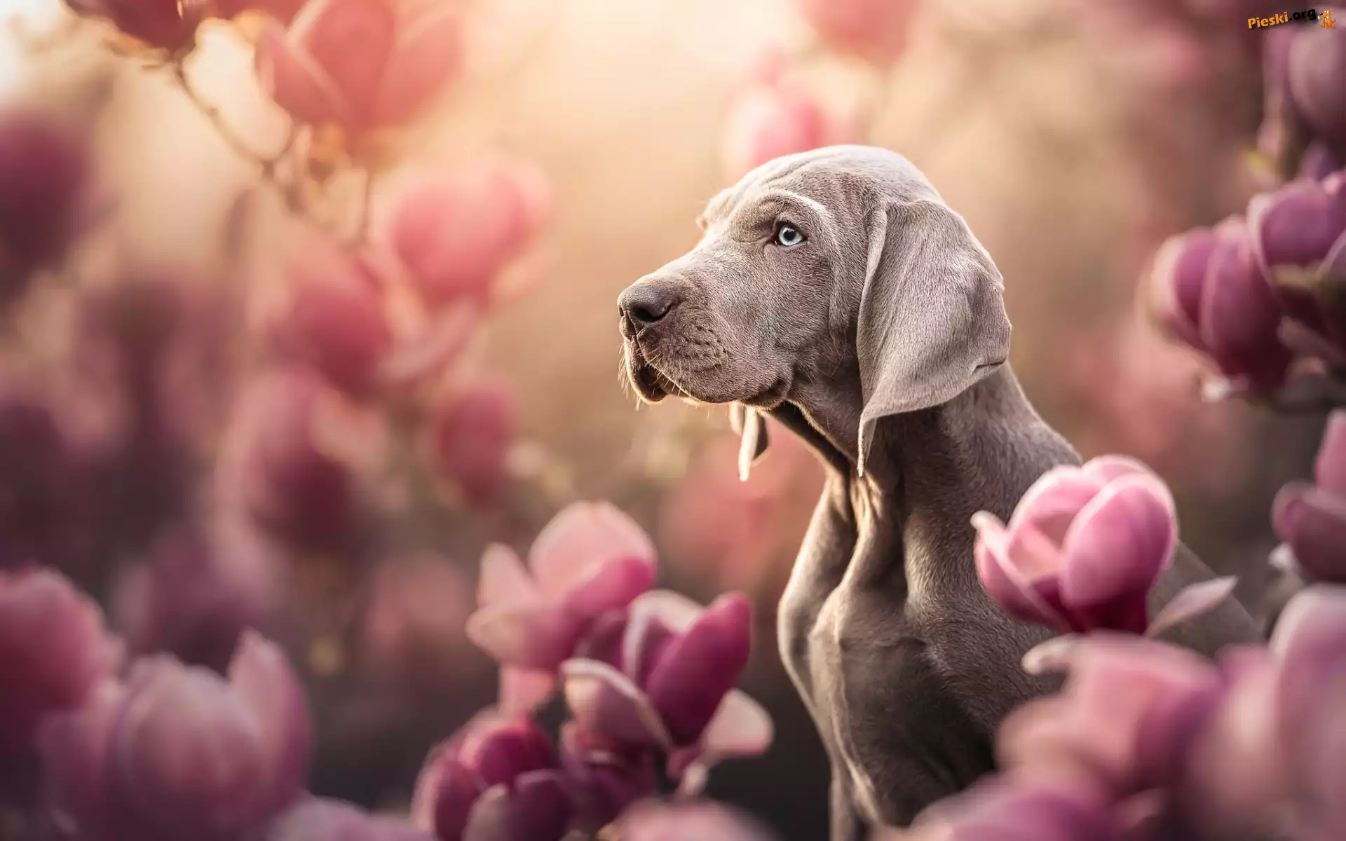 Kwiaty, Rozmycie, Pies, Magnolie, Wyżeł weimarski, Pieski
