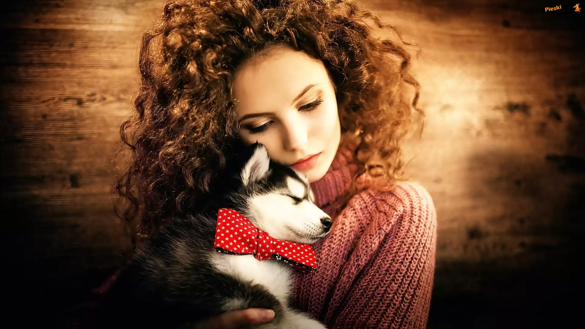 Husky, Młoda, Kolorowa, Dziewczyna, Smutna, Szczeniaczek, Muszka, Pieski