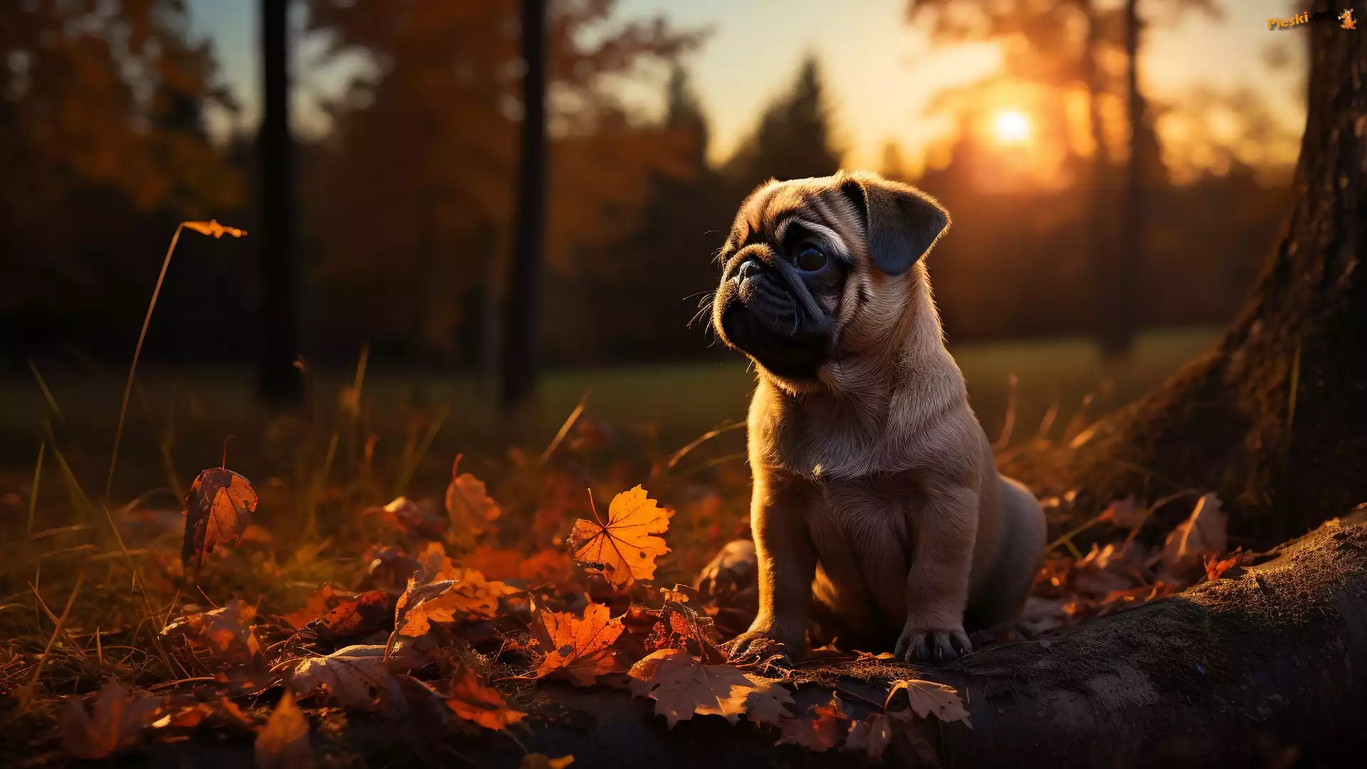 Liście, Drzewo, Pies, Mops, Pieski