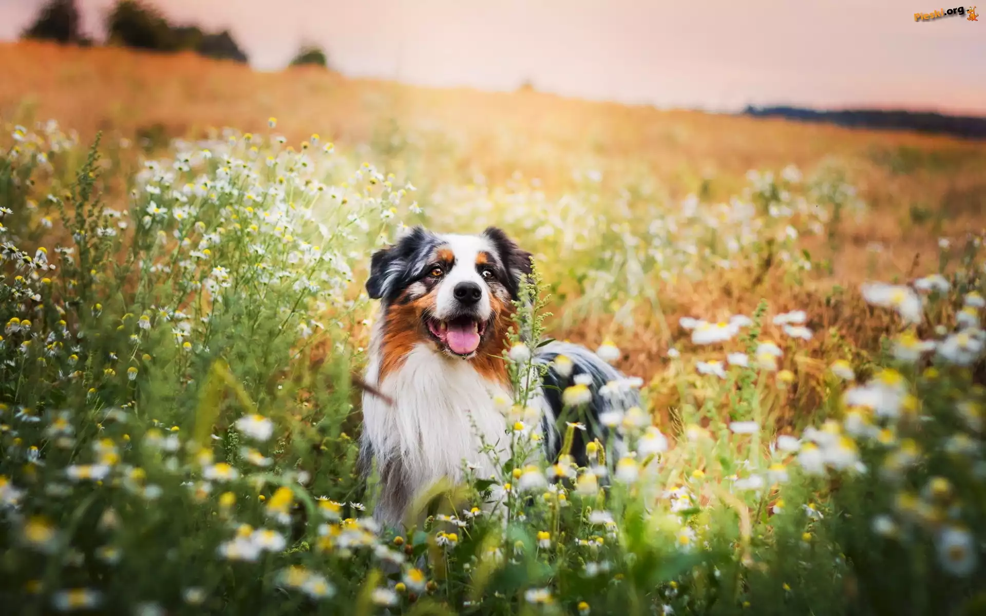 Owczarek australijski, Australian shepherd, Łąka, Pieski