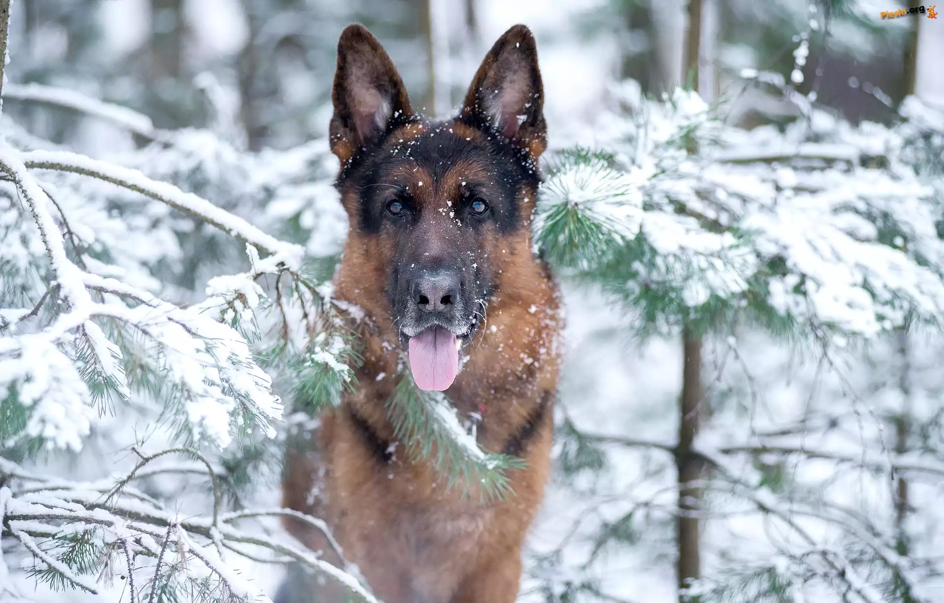 Świerki, Zima, Zaśnieżone, Owczarek niemiecki