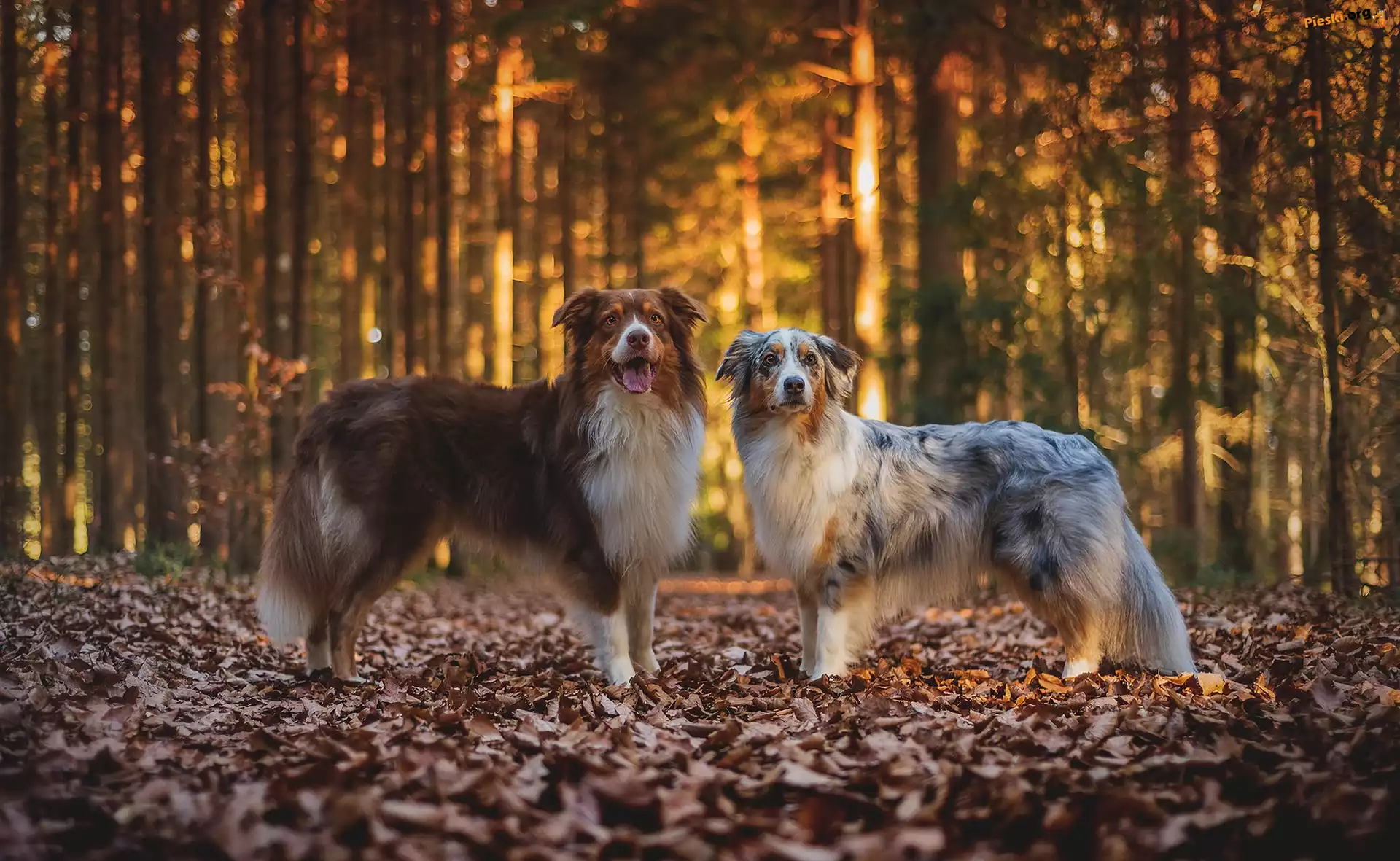 Jesień, Owczarki australijskie, Psy, Las, Dwa, Liście