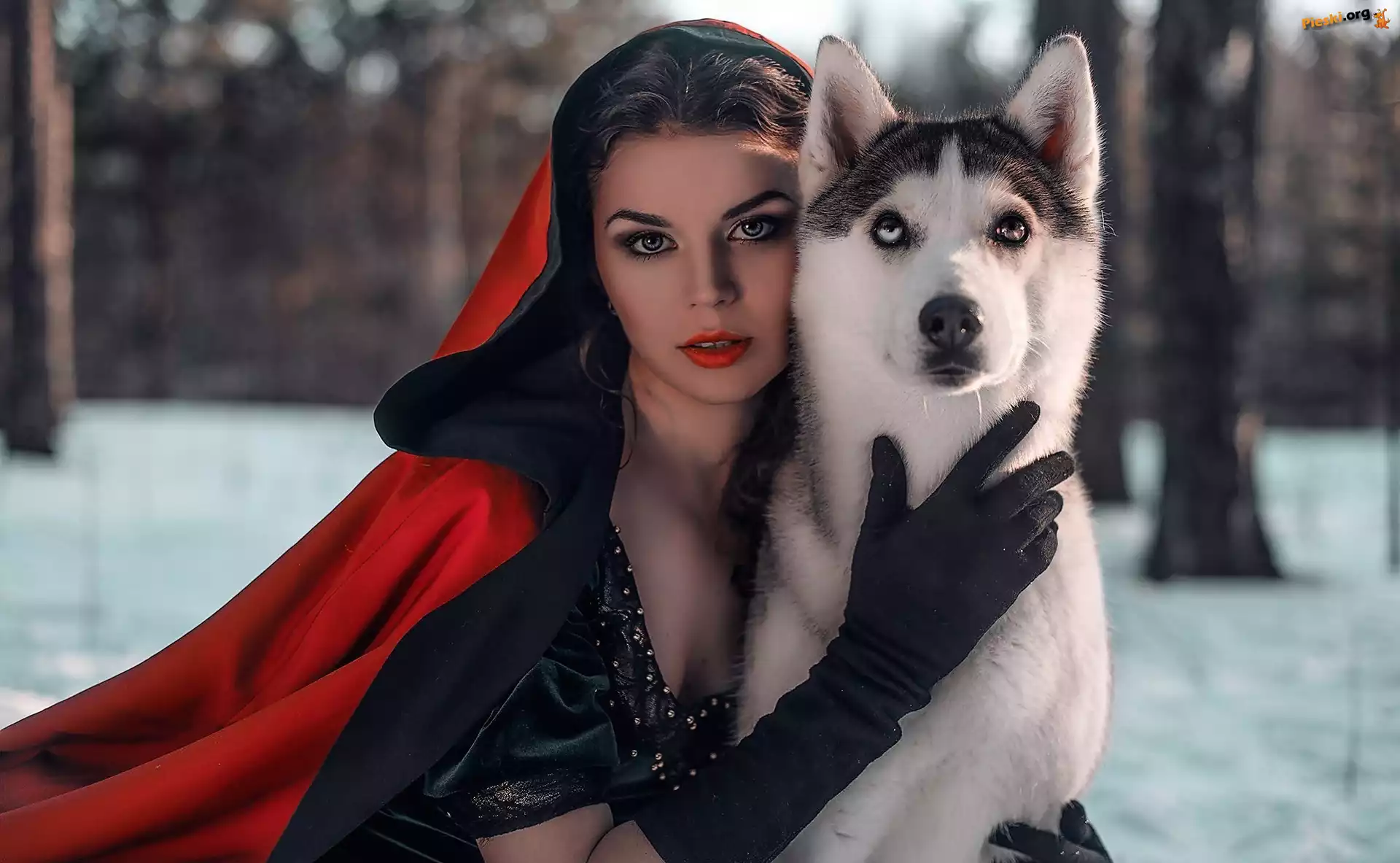 Pies, Czerwona, Kobieta, Peleryna, Husky, Pieski