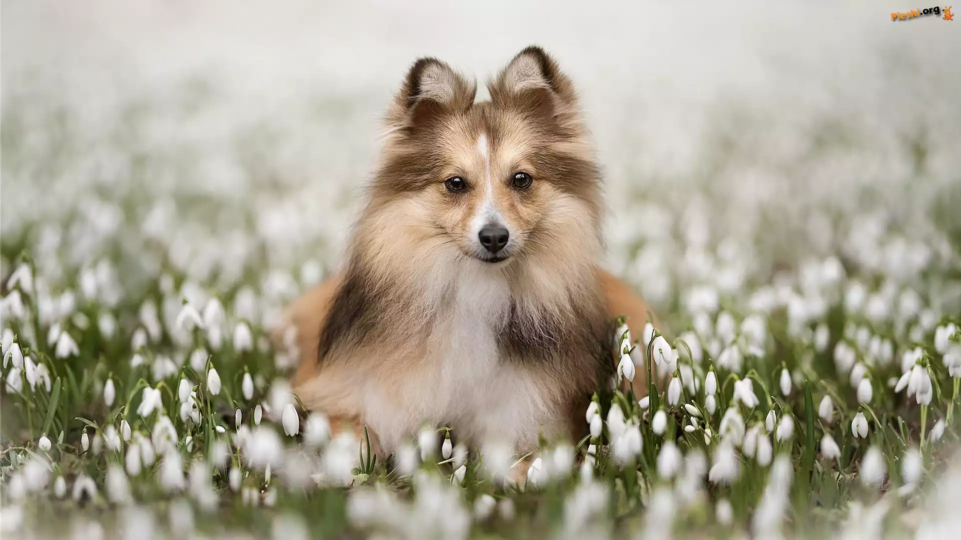 Kwiaty, Szczeniak, Pies, Przebiśniegi, Owczarek szetlandzki, Pieski