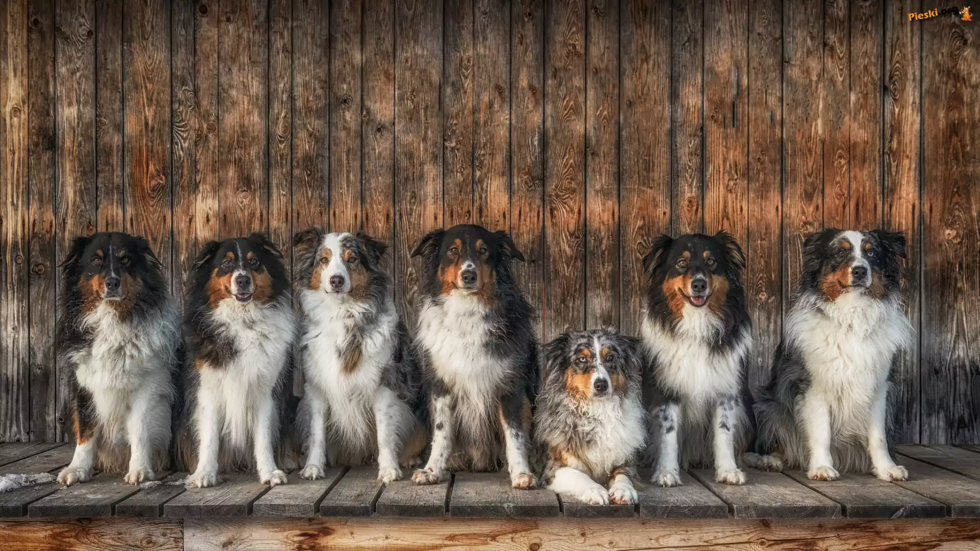 Podest, Psy, Ściana, Owczarki Australijskie, Siedem, Drewniany, Deski