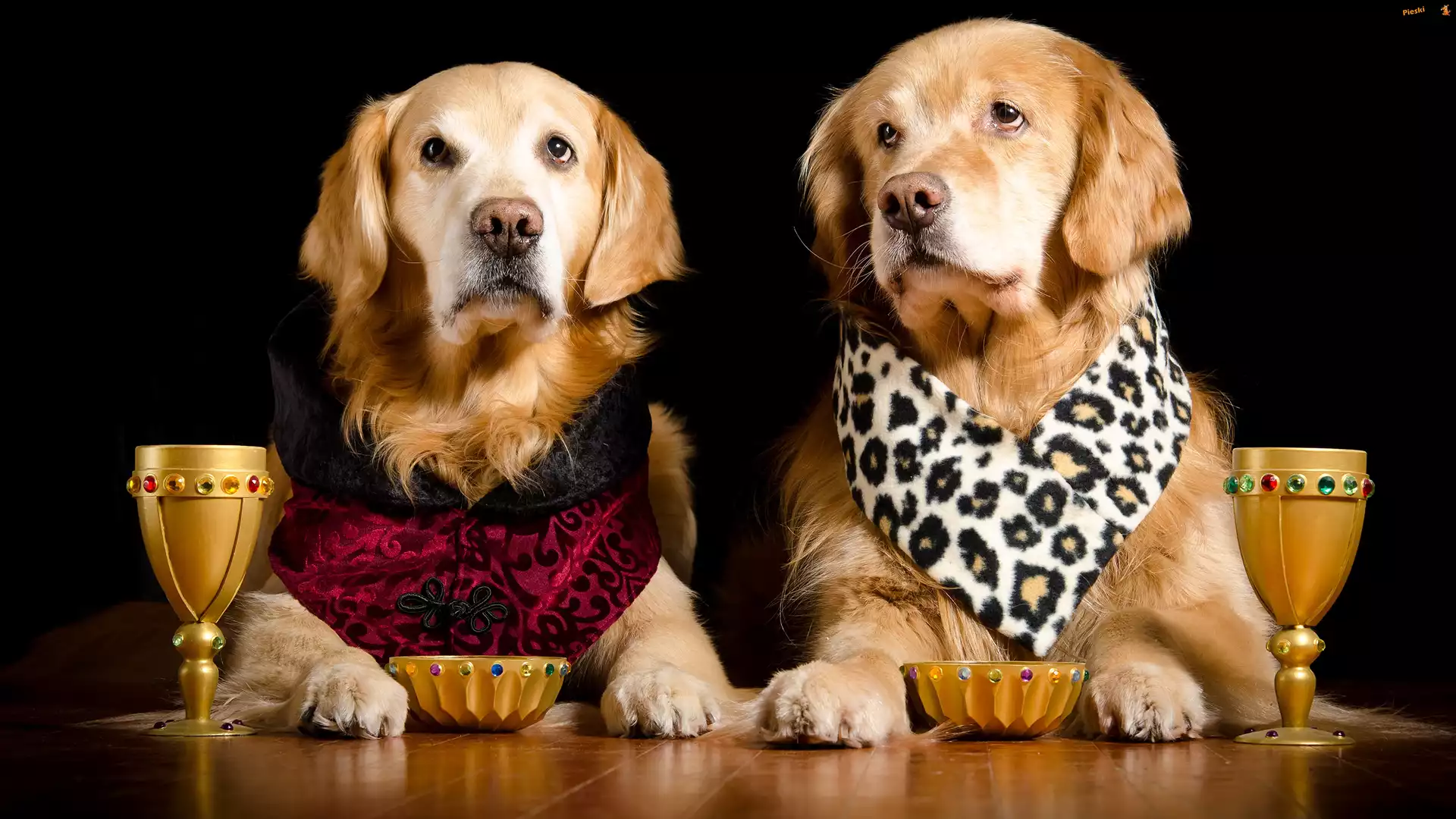 Kieliszki, Psy, Golden retriever, Dwa, Miski, Ubranko