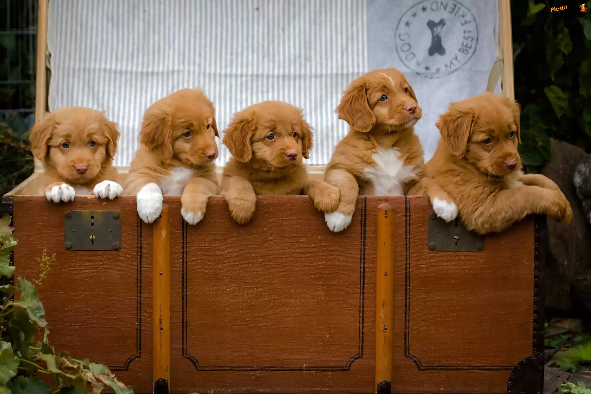 Retriever, Słodkich, Pięć, Szczeniaczków, Skrzynia, Pieski