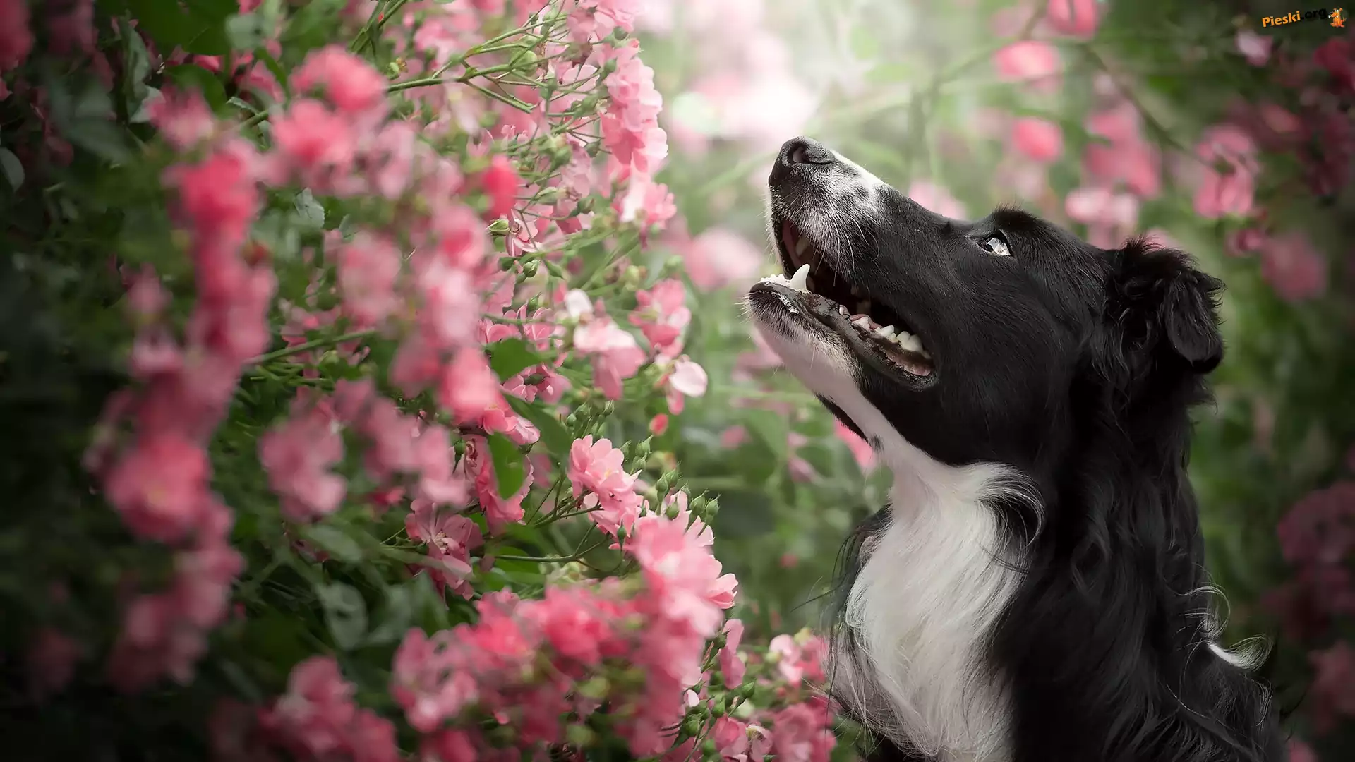 Różowe, Border collie, Pies, Krzew, Kwiatki, Pieski