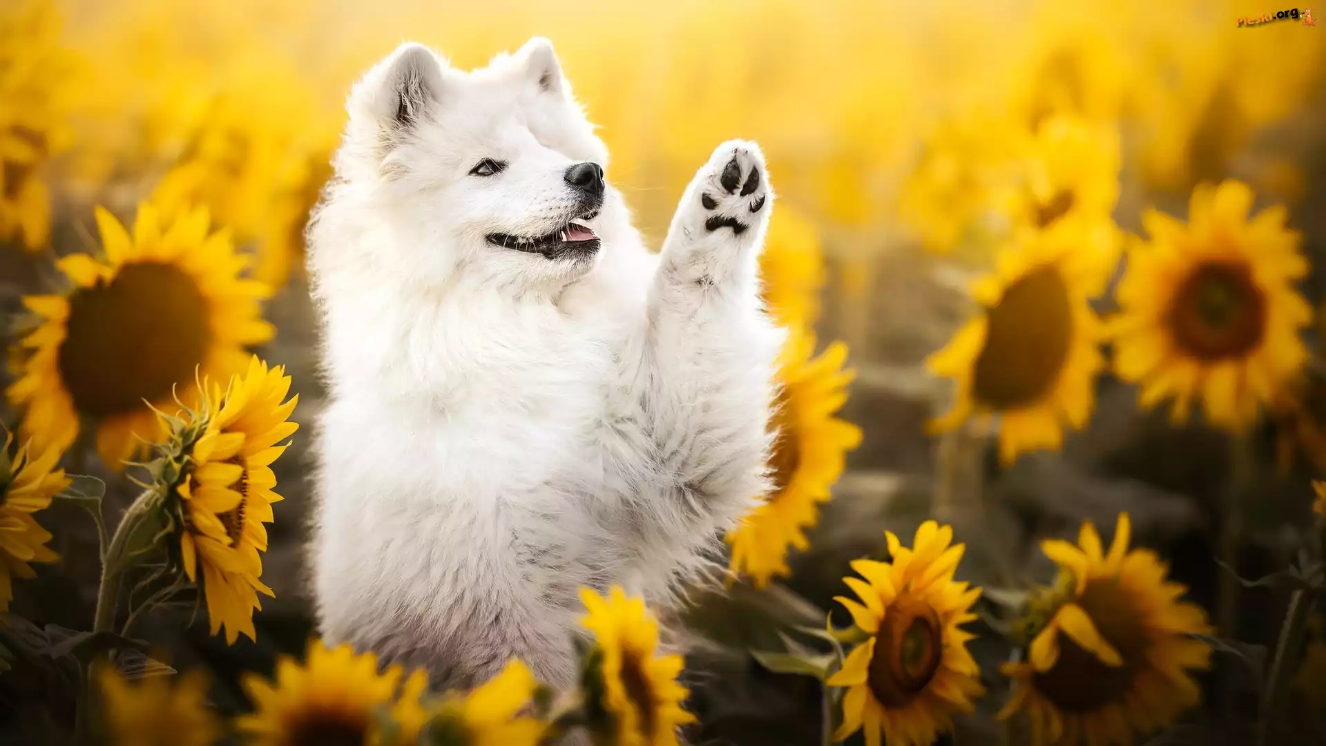 Słoneczniki, Kwiaty, Pies, Samojed, Pieski