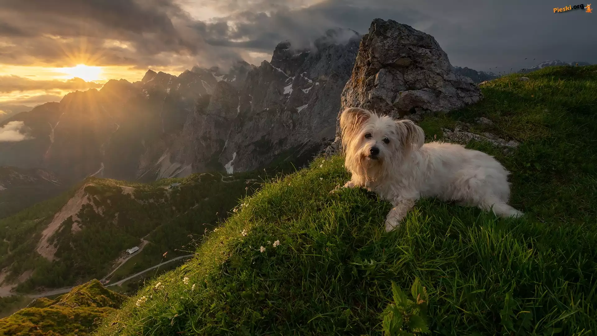 Alpy Julijskie, Szczyt, Wschód słońca, Pies, Trawa, Góry, Słowenia, Pieski