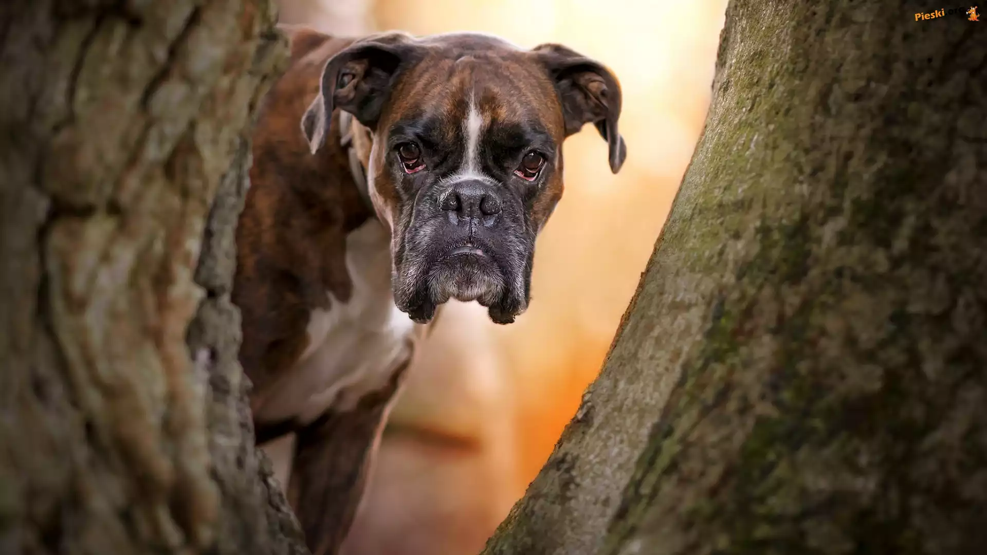 Spojrzenie, Pies, Bokser, Drzewo, Pieski
