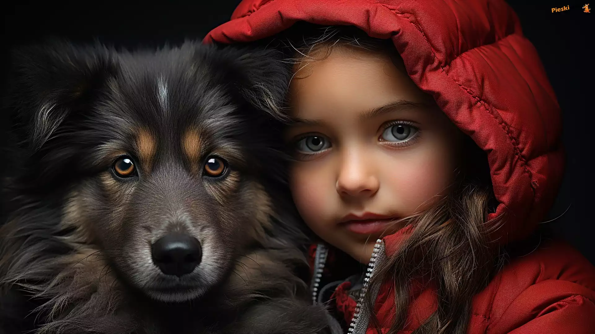 Grafika, Czerwona, Kurtka, Spojrzenie, Dziewczynka, Kaptur, Pies, Pieski