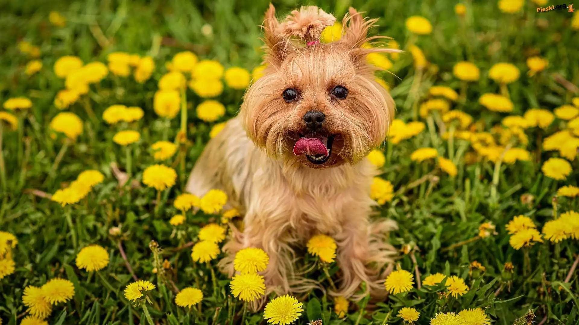 Pies, Trawa, Mlecze, Yorkshire terrier, Kwiaty, Łąka, Pieski