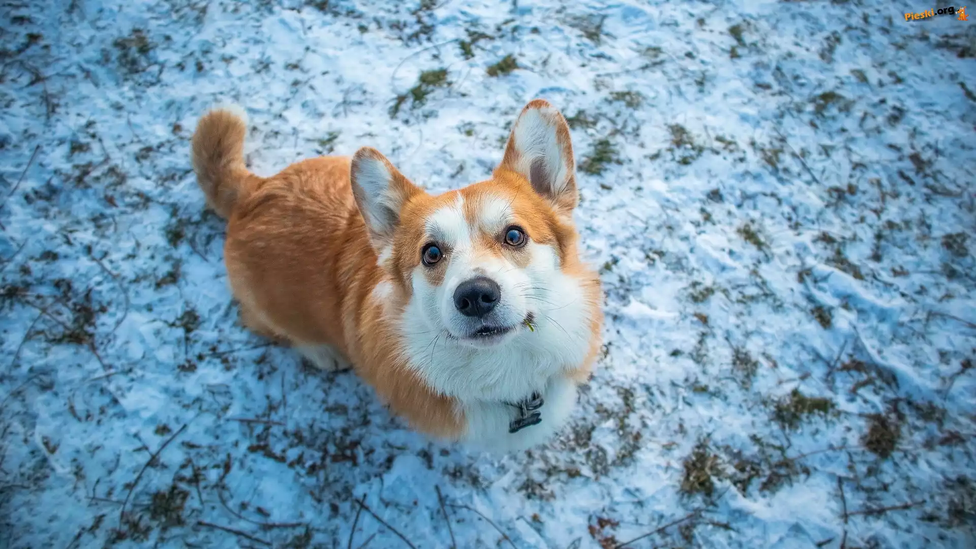 Zima, Spojrzenie, Pies, Trawa, Welsh corgi pembroke, Pieski