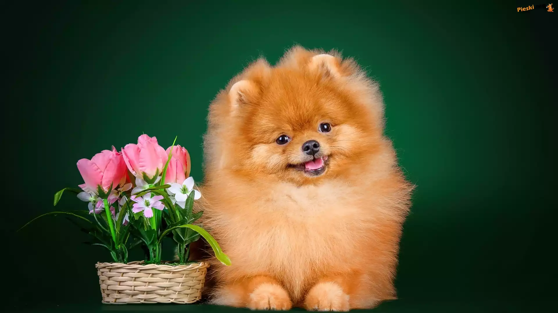 Piesek, Pomeranian, Tulipany, Szpic miniaturowy, Koszyk