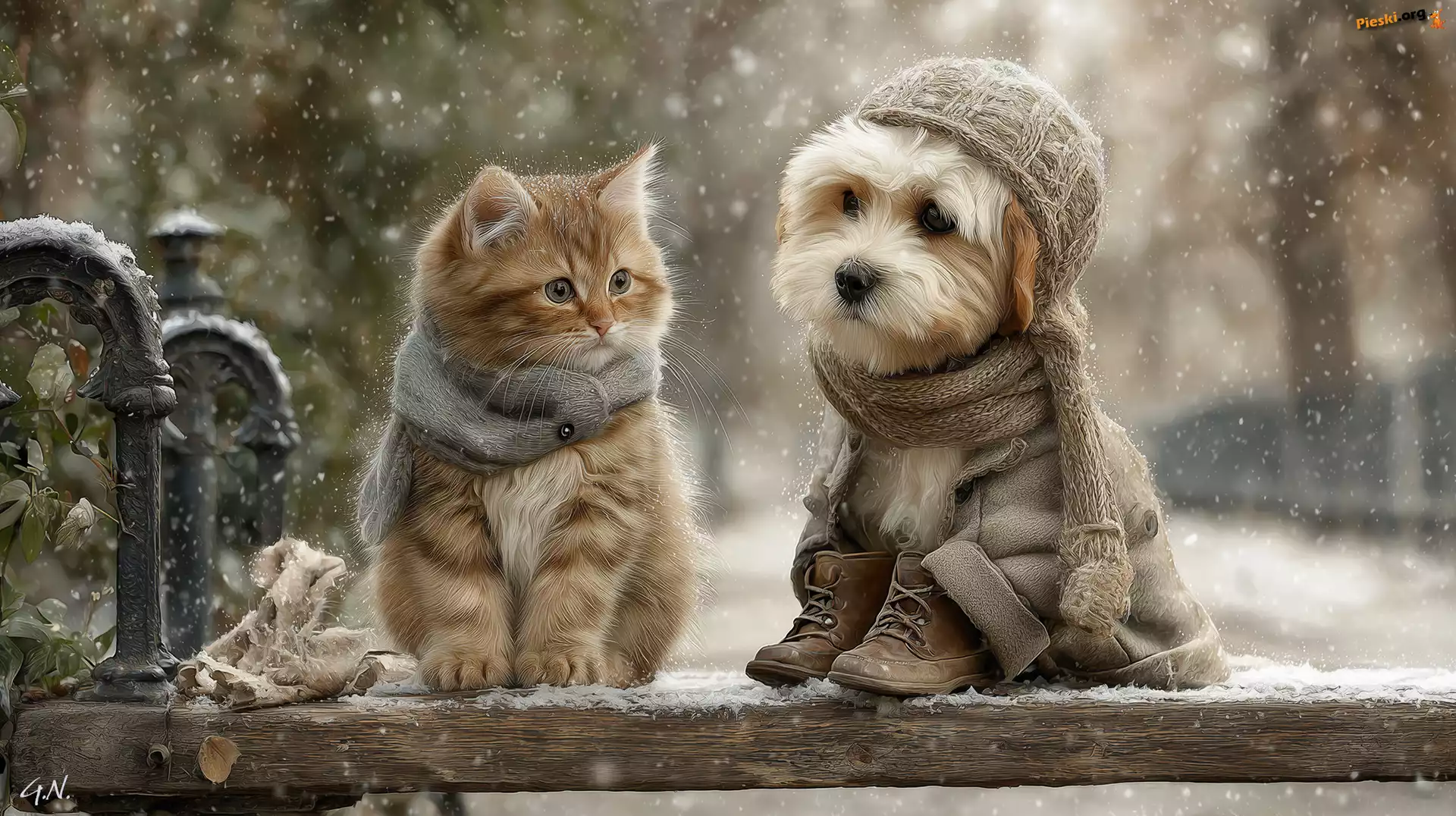 Grafika AI, Kot, Ubranka, Pies, Zima, Ławka