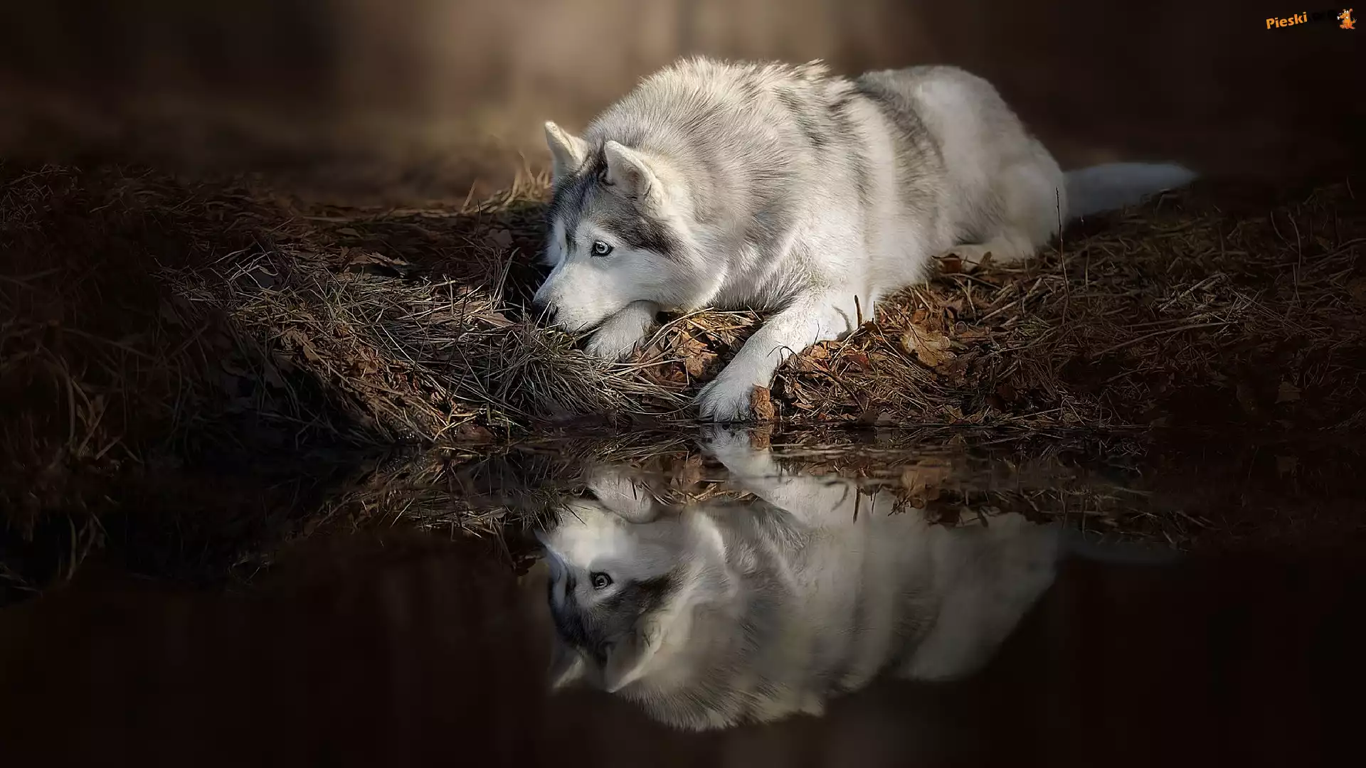 Woda, Leżący, Pies, Siberian husky, Odbicie, Pieski