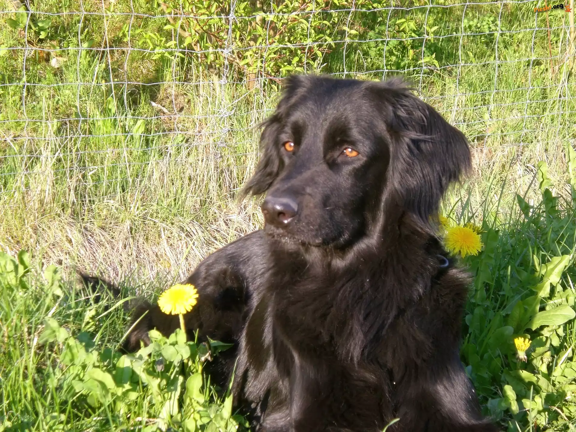 żółte, czarny, Hovawart, kwiatki, Pieski